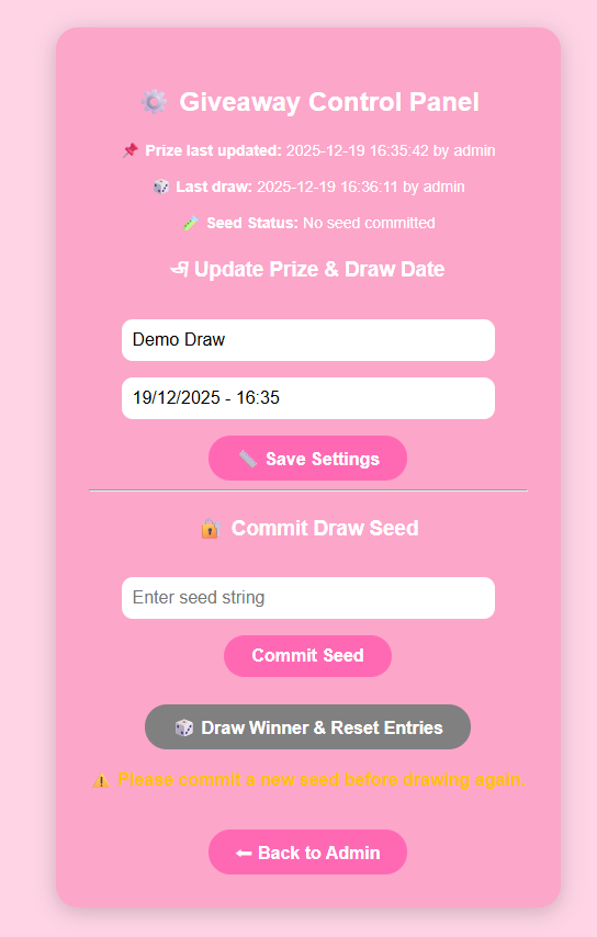 A custom giveaway system was implemented with provable fairness, including administrative controls, draw logging, and public verification pages. A protected admin area provides full oversight while separating public and internal functionality.