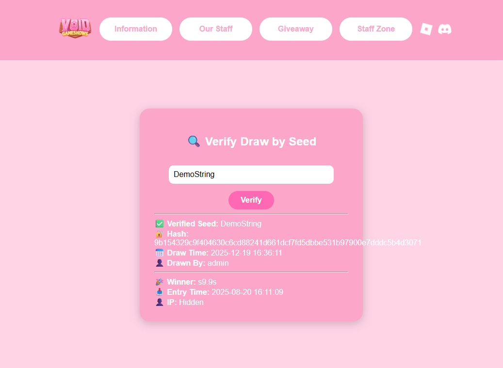 A custom giveaway system was implemented with provable fairness, including administrative controls, draw logging, and public verification pages. A protected admin area provides full oversight while separating public and internal functionality.